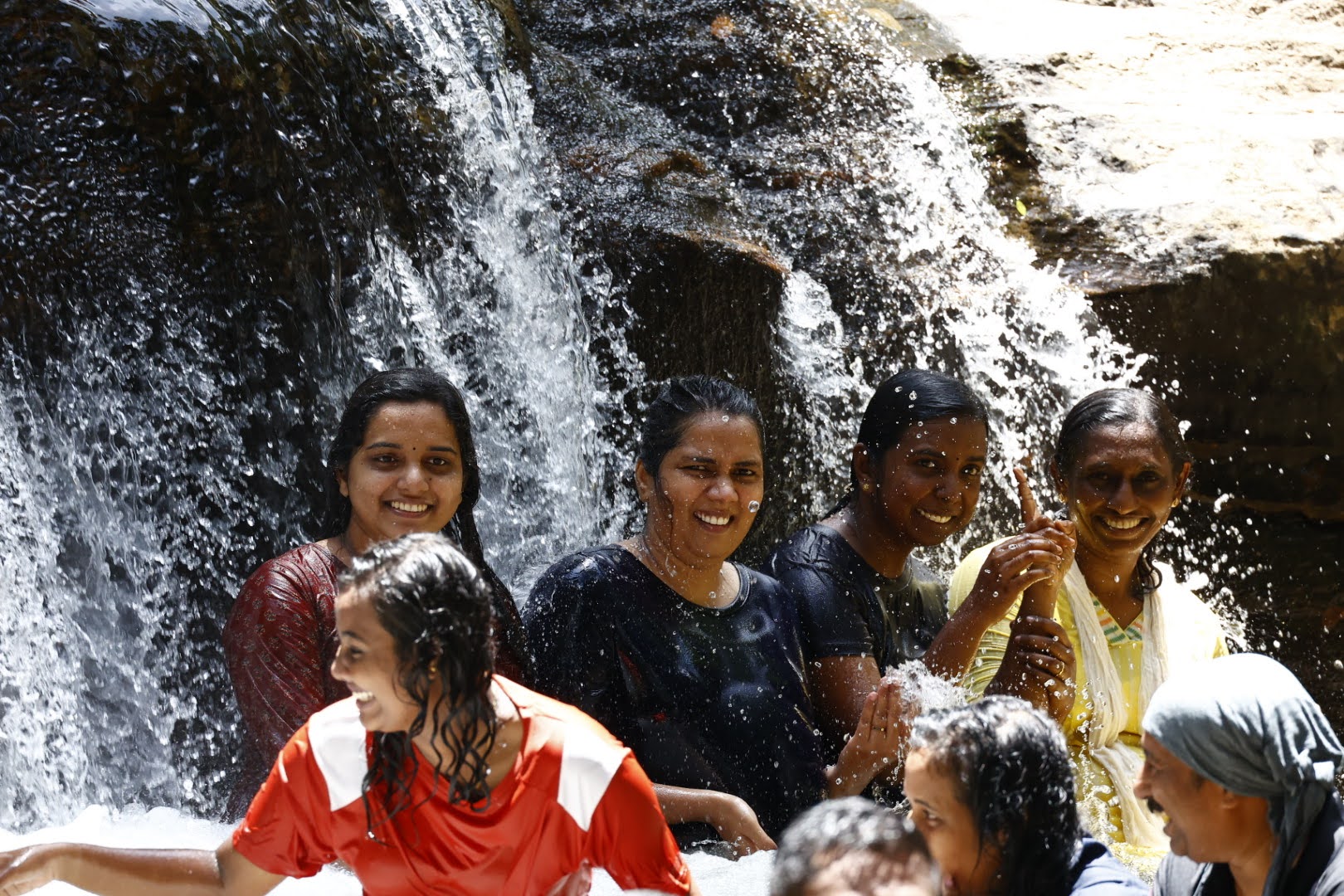 During monsoon, the waterfall transforms into a gushing cascade with step-like rock formations, creating a surreal and adventurous setting.